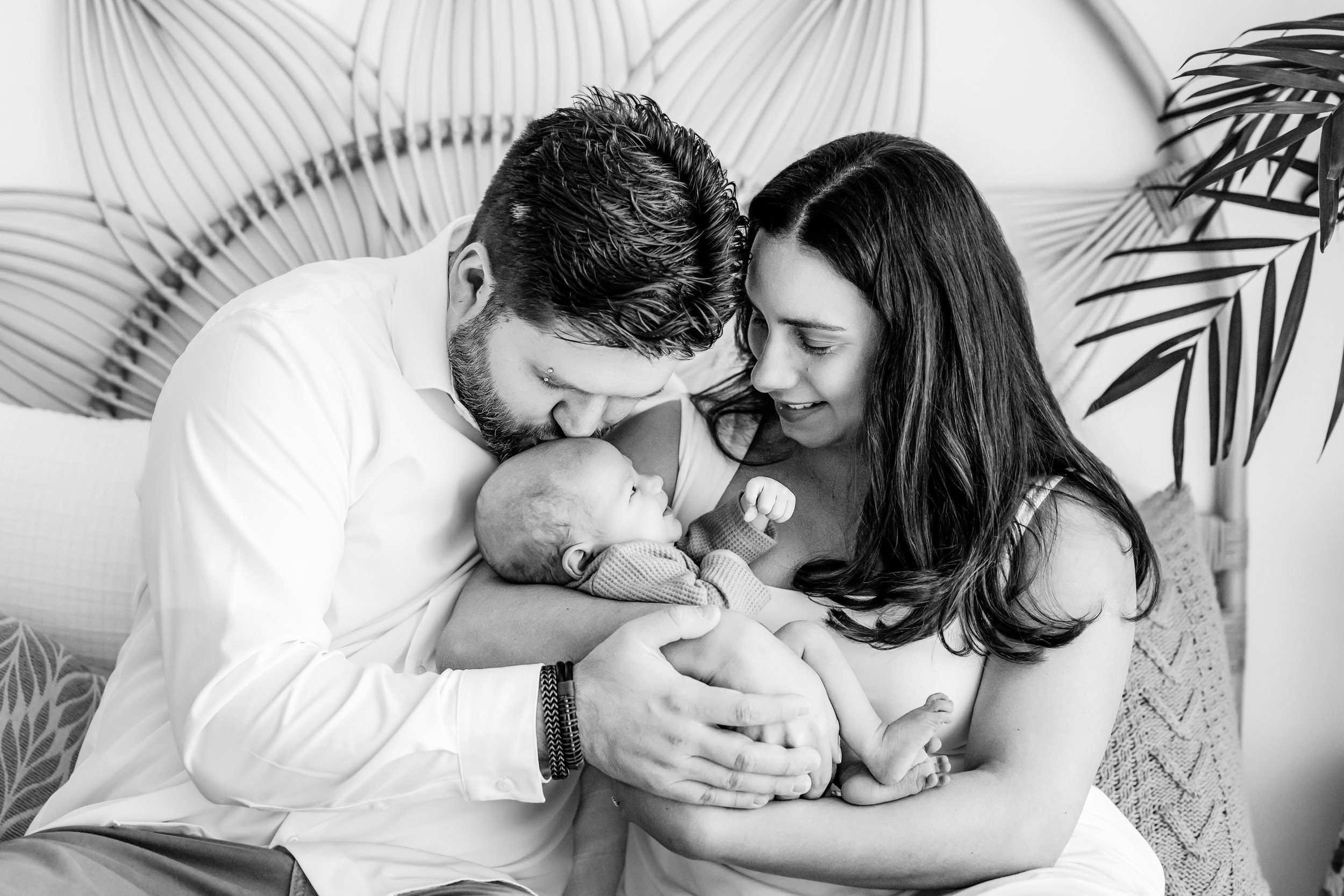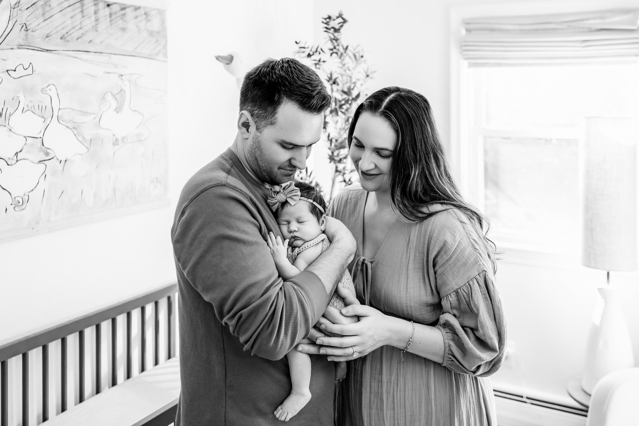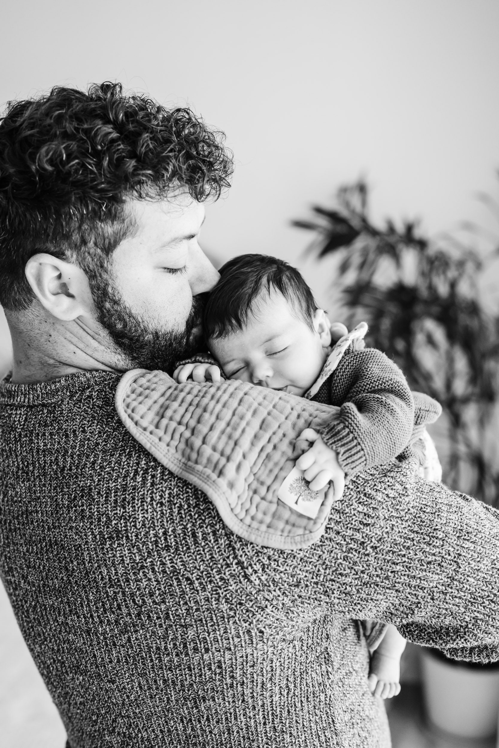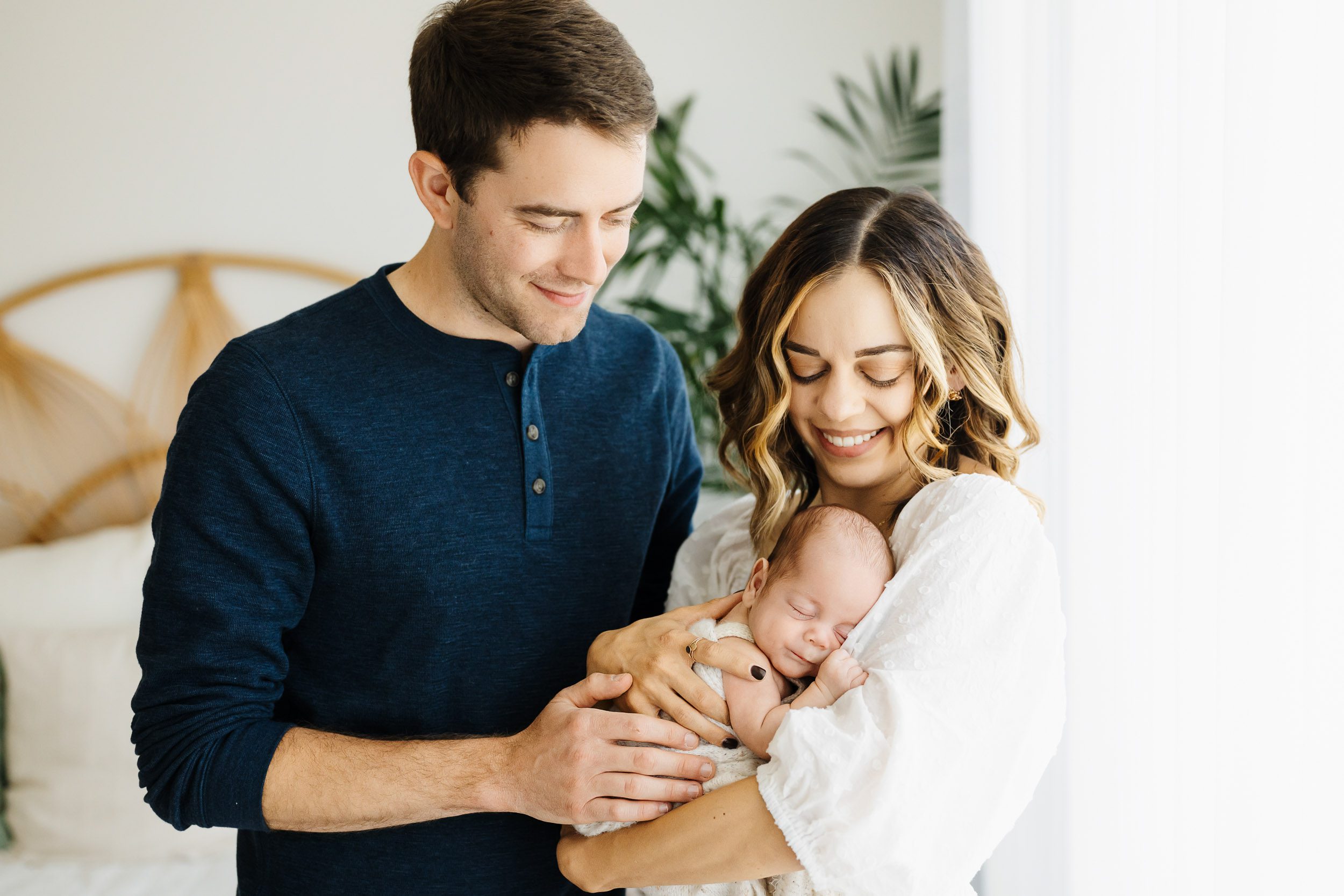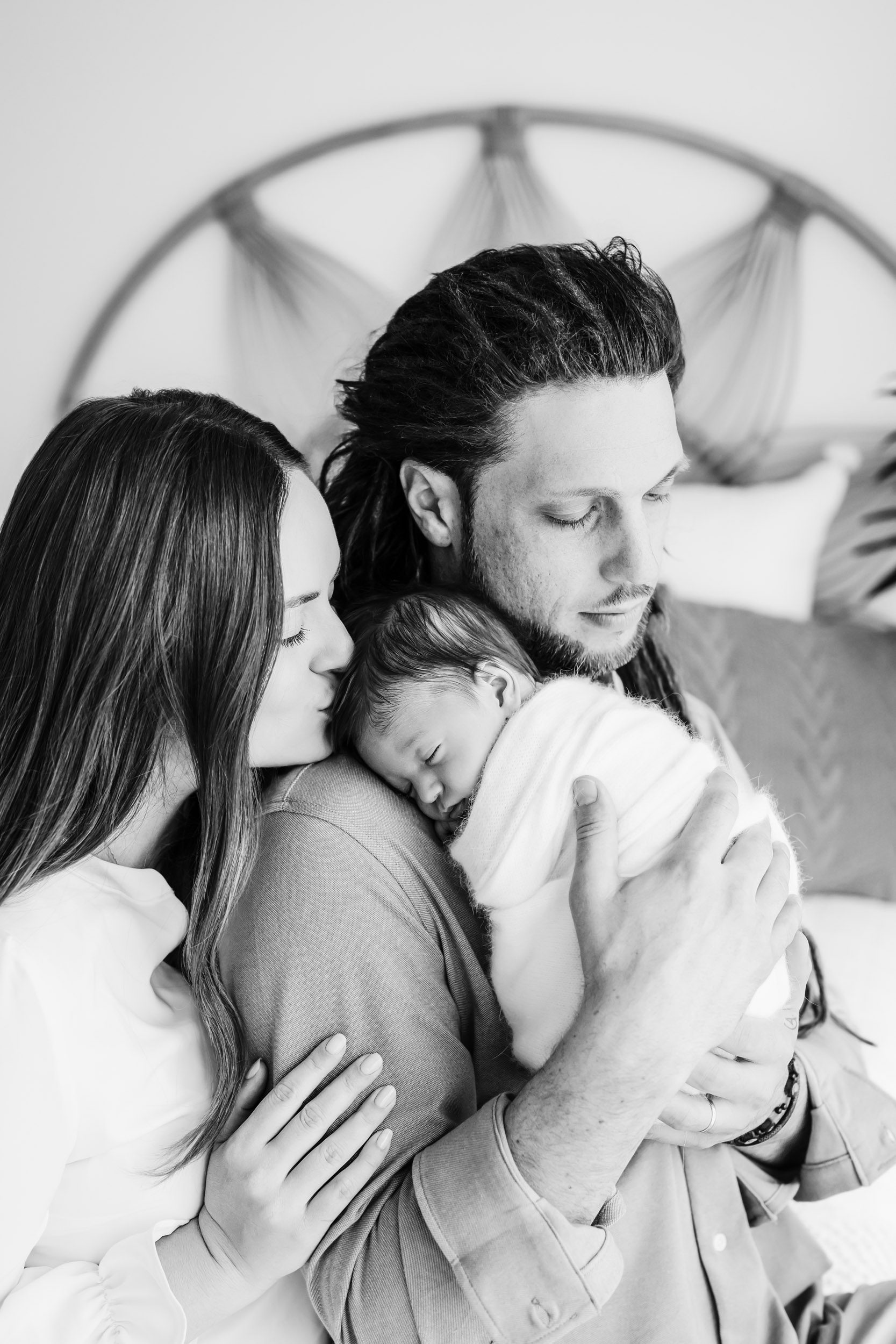 - Cradling the baby and giving lots of kisses and cuddles – I always do this sequence once with Mom holding the baby, and then again with Dad holding the baby for lots of sweet interactions. This shot works well with the parents sitting on a bed or standing next to a window.