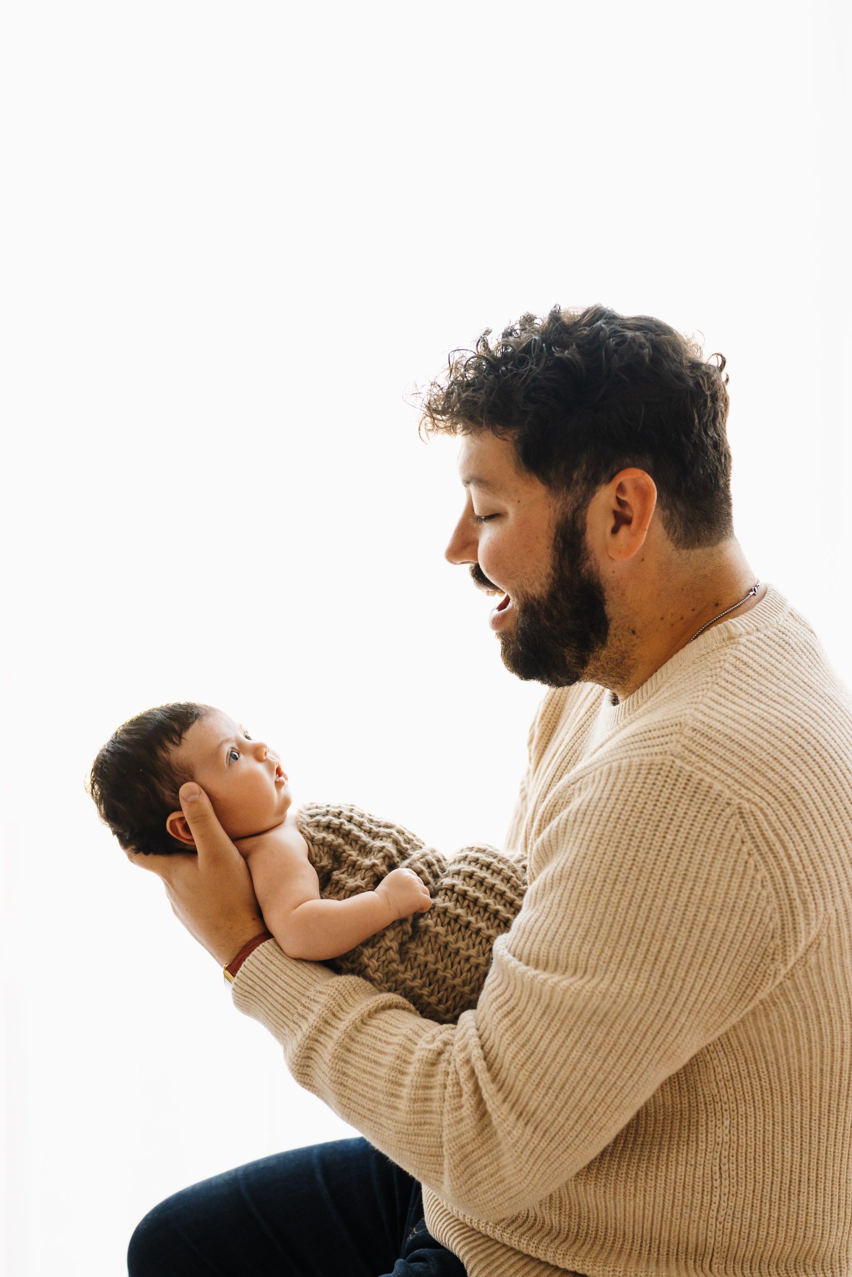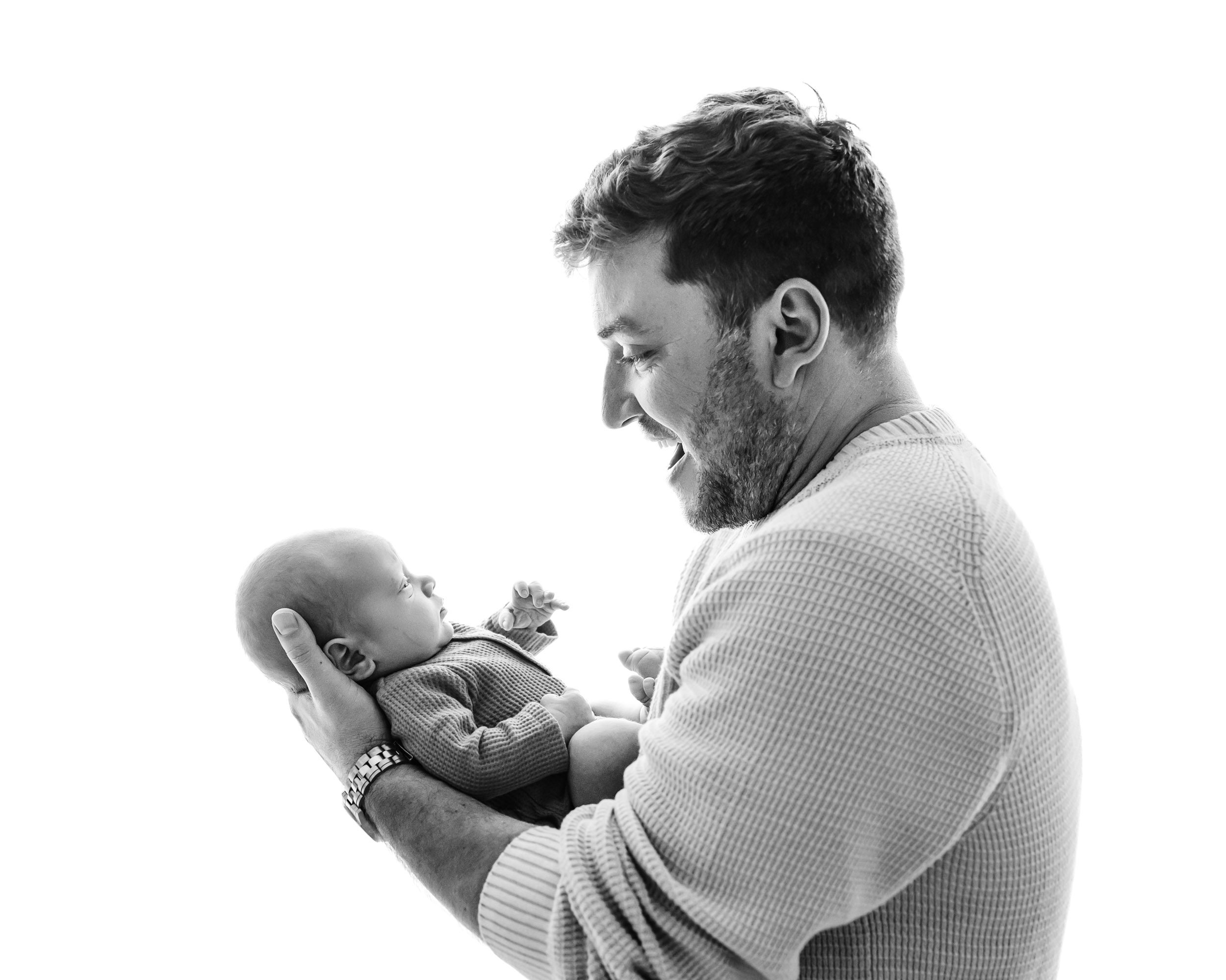 - Dad holding the baby out in front of him and smiling down at the baby: