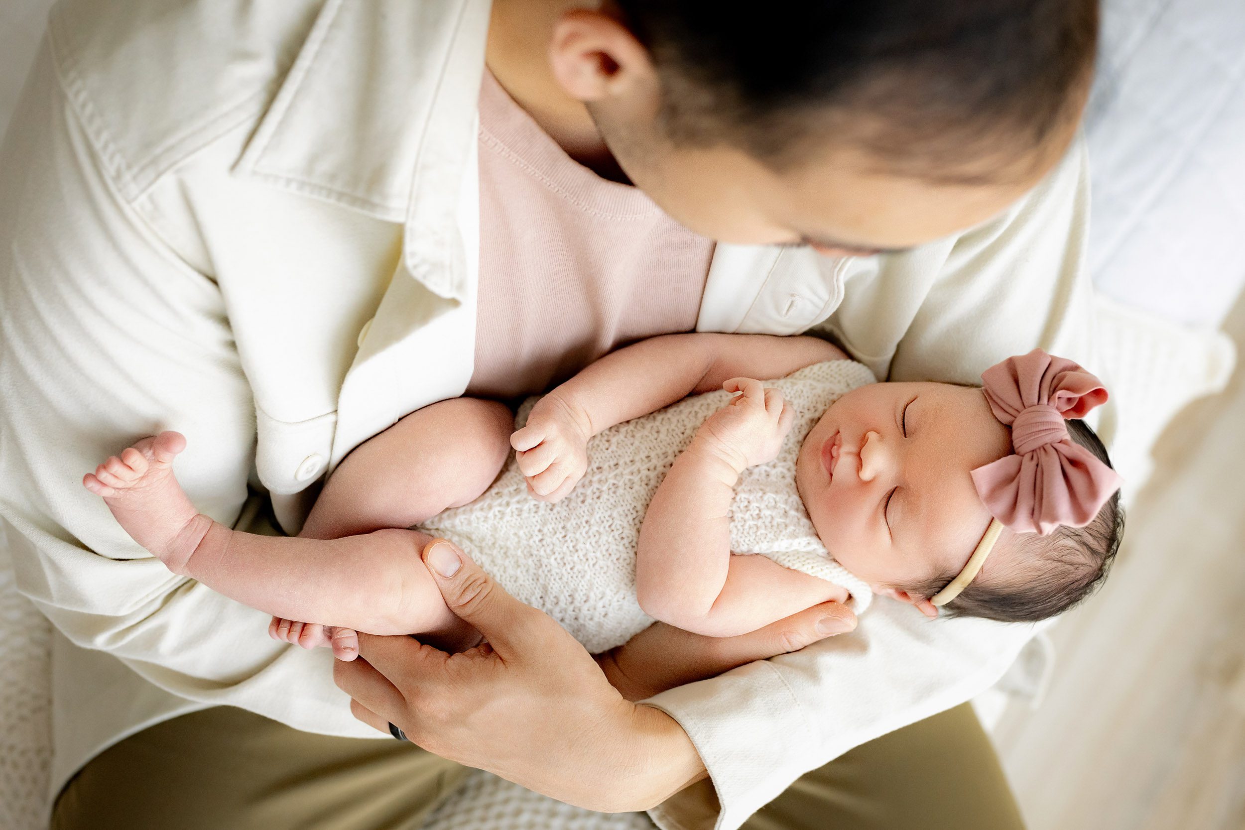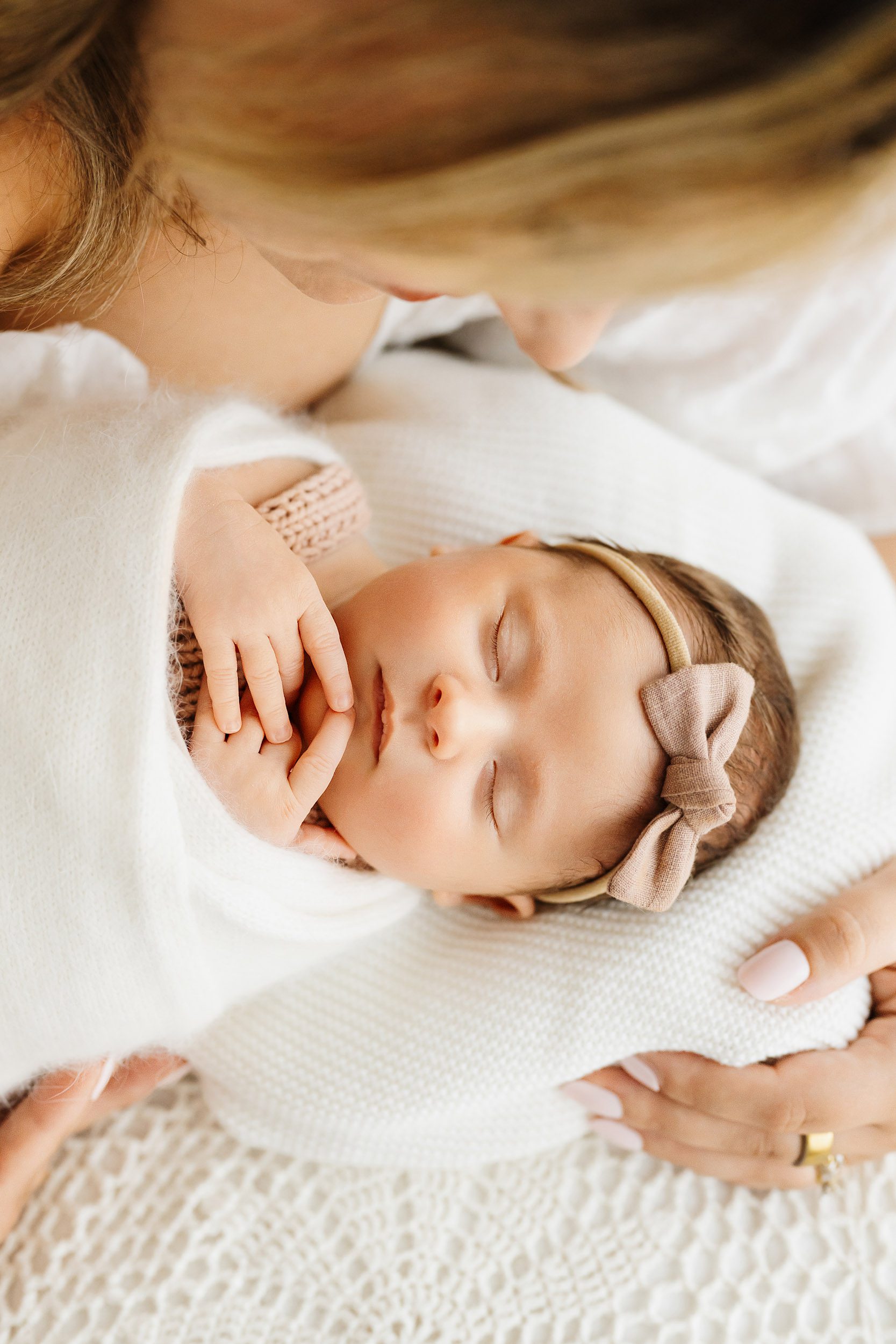- No props → occasionally special items (such as a baby blanket knitted by Grandma, for example) are incorporated at the family’s request, but wrapping, swaddling, and other elements are typically integrated into the newborn photos in a more natural way
