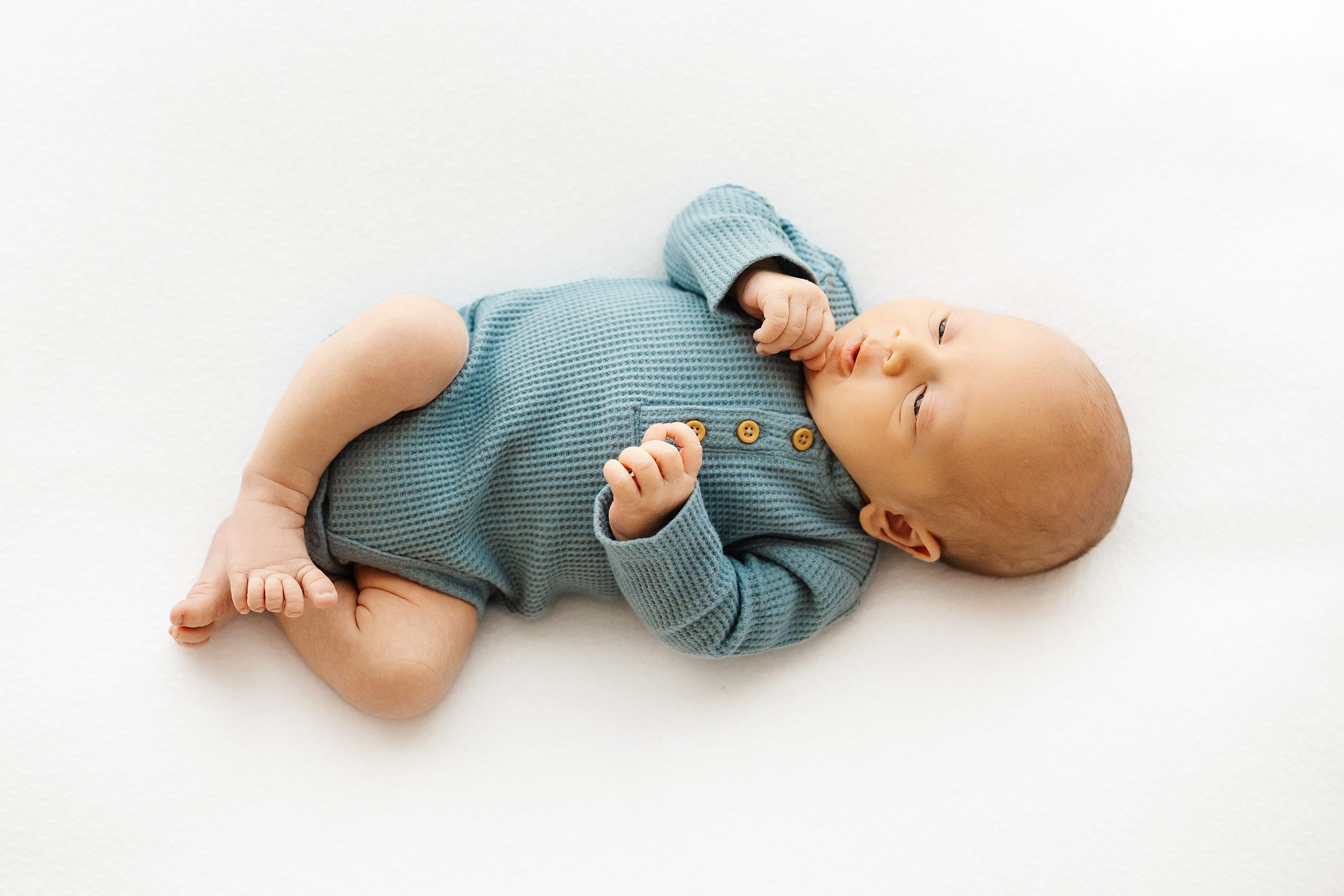 My goal as a newborn photographer is to capture your baby in a way that is genuine, so I don’t try to make babies fall asleep for their newborn photos or pose them with props. The way they grab onto your finger with their tiny hands. The crinkly yawn face. How he nuzzles into your chest with a big sigh after a good feeding and a burp. The full on crying face in one shot followed by a sweet little gassy smile in the next shot. That moment she discovers her hand and can’t tear her eyes away from it because it’s the most fascinating thing she’s ever seen. And possibly my favorite detail (one that many newborn photographers sacrifice for the sake of posing): those wide open eyes as they explore their world with wonder.