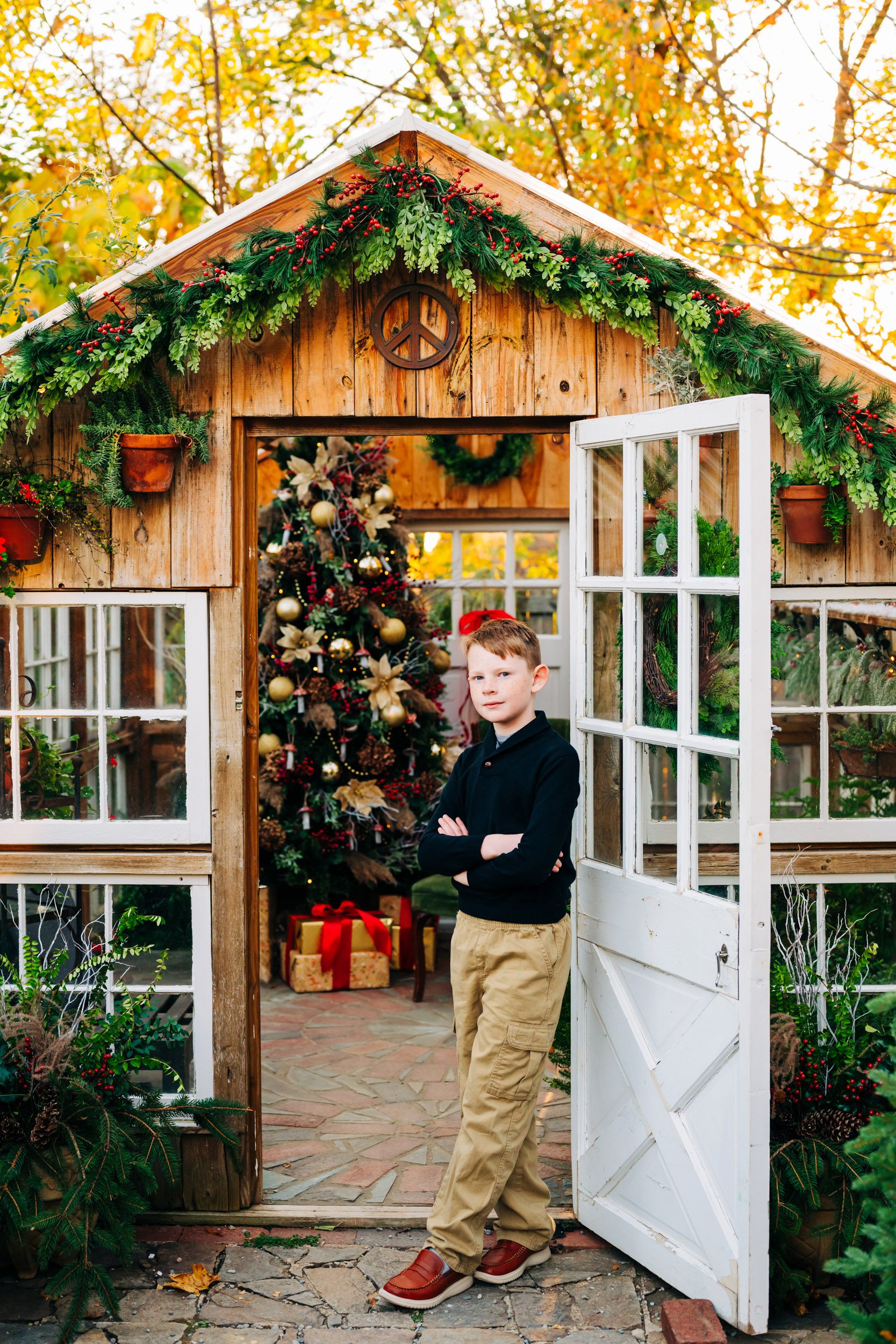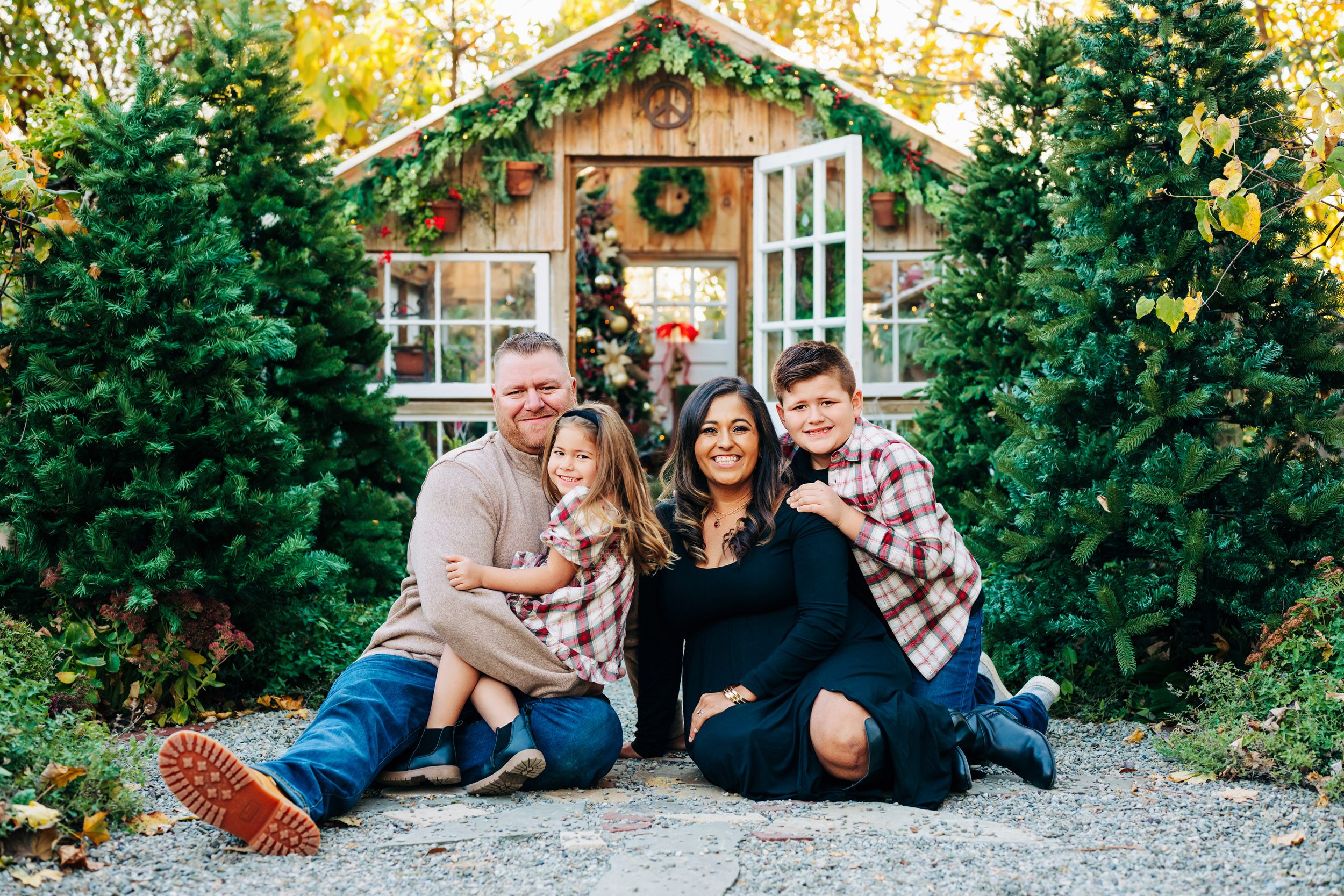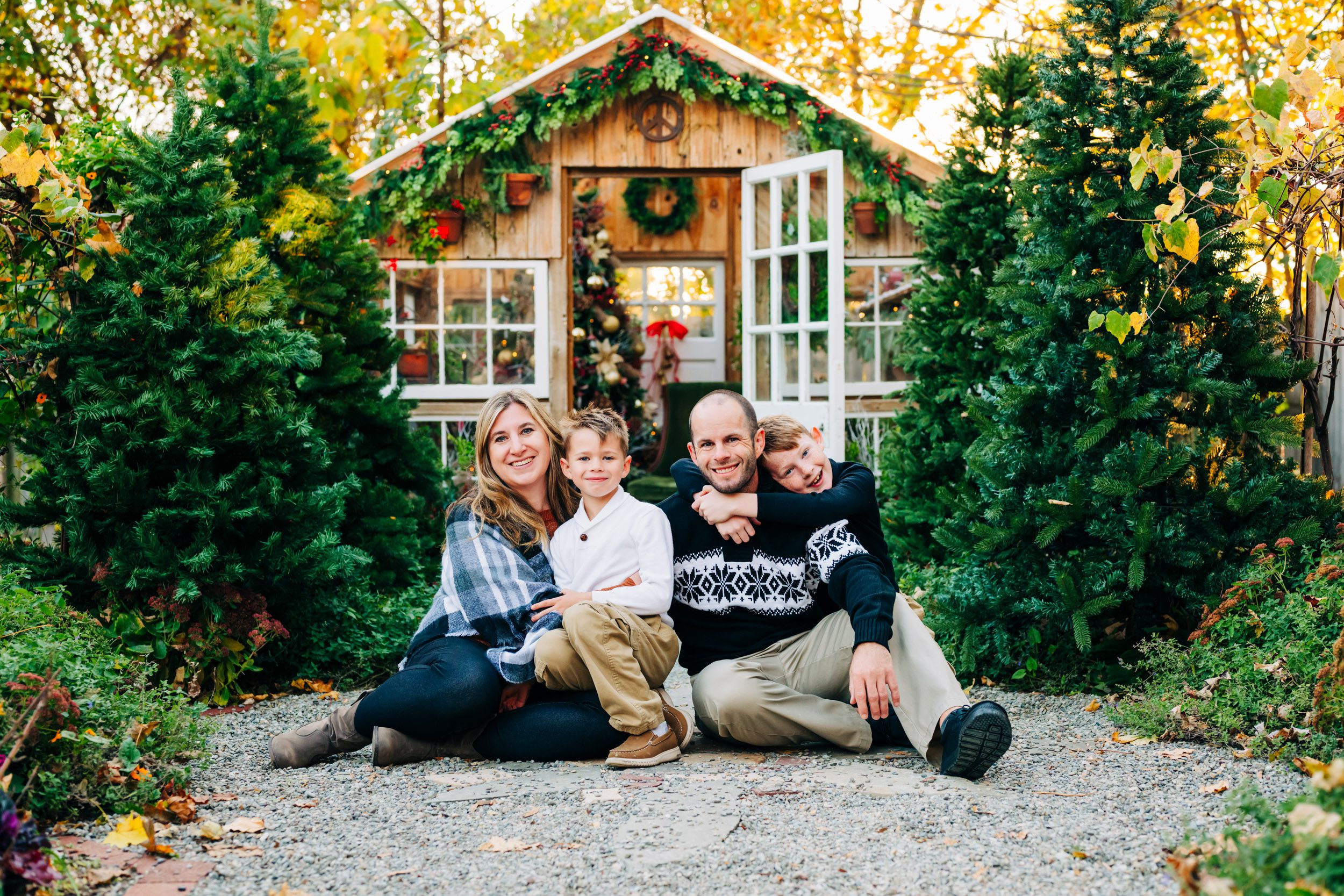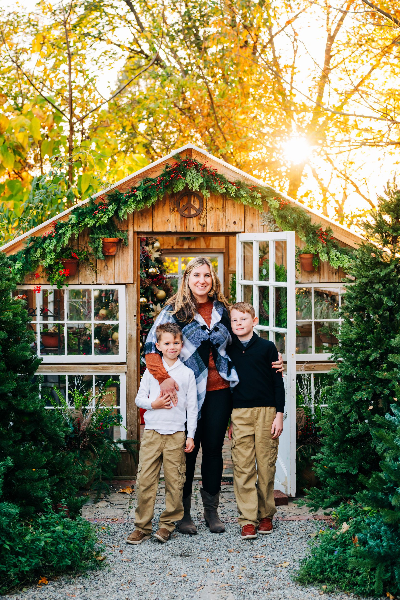 This private garden located in West Chester, PA, has quickly become one of my favorite spots for holiday photos. When you enter the garden, a stone mosaic path lined with Christmas trees leads up to a beautiful greenhouse, decked out with a fully decorated Christmas tree and holiday decor. And as the setting sun shines through the trees in the background, the whole setting glows with the warmth and joy of the holidays!