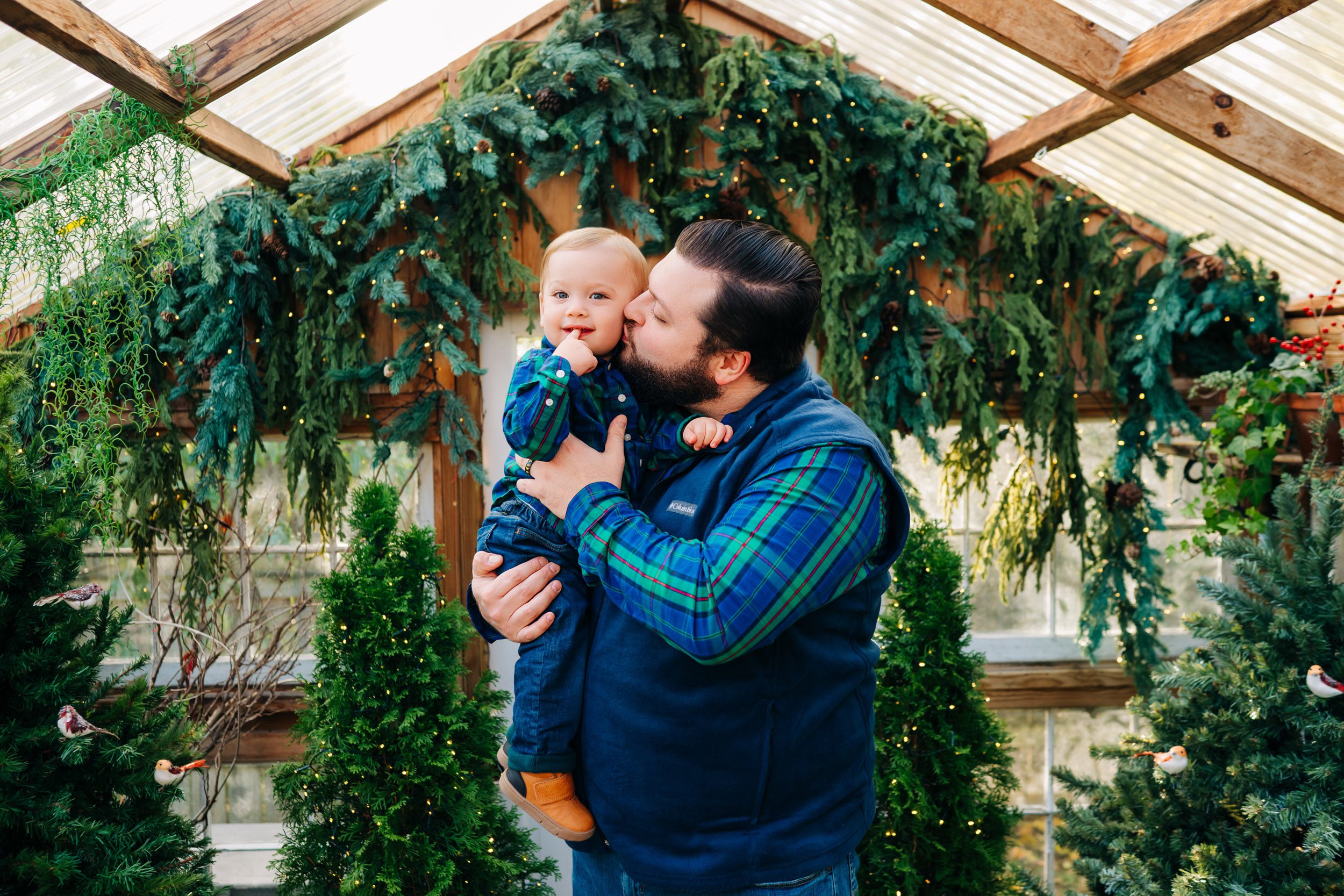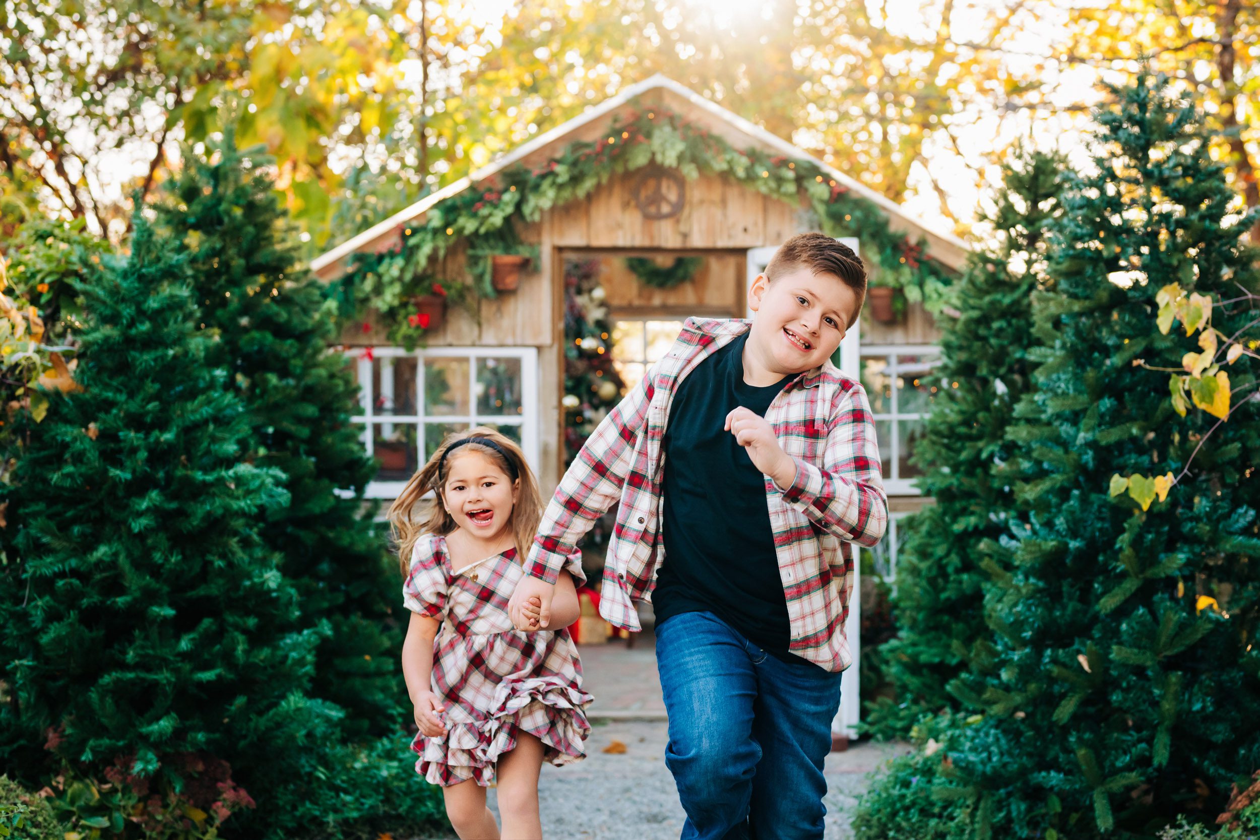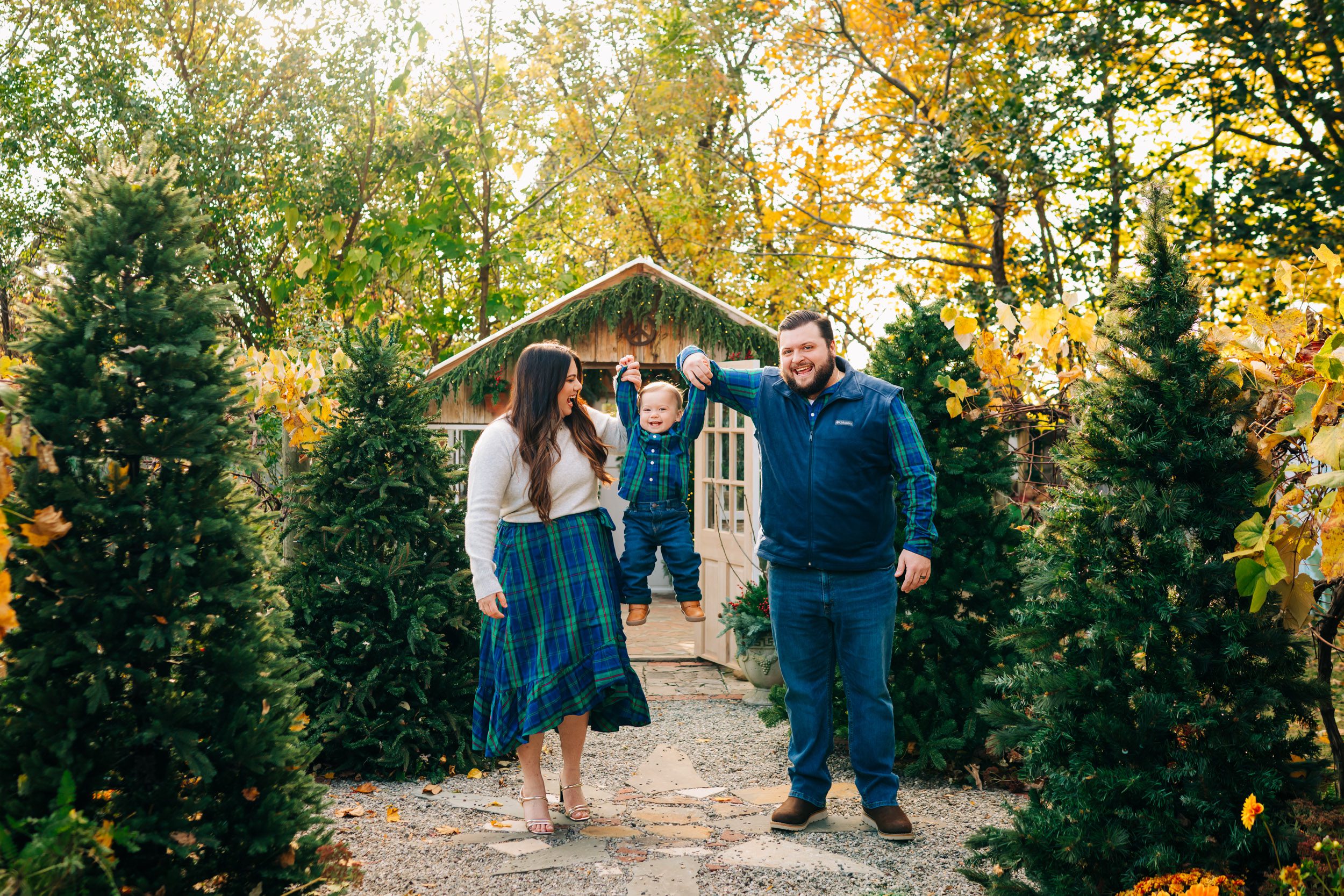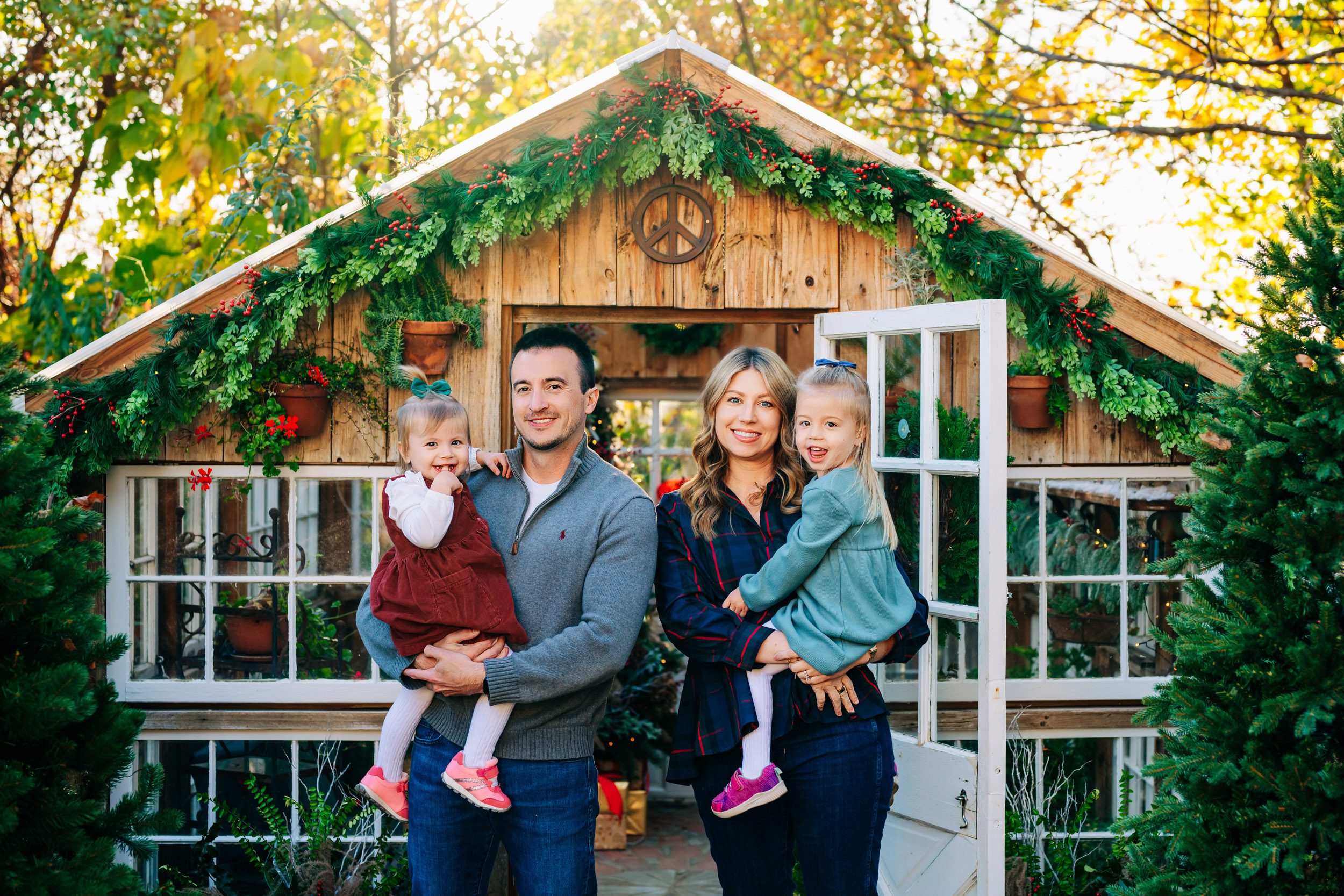 This private garden located in West Chester, PA, has quickly become one of my favorite spots for holiday photos. When you enter the garden, a stone mosaic path lined with Christmas trees leads up to a beautiful greenhouse, decked out with a fully decorated Christmas tree and holiday decor. And as the setting sun shines through the trees in the background, the whole setting glows with the warmth and joy of the holidays!