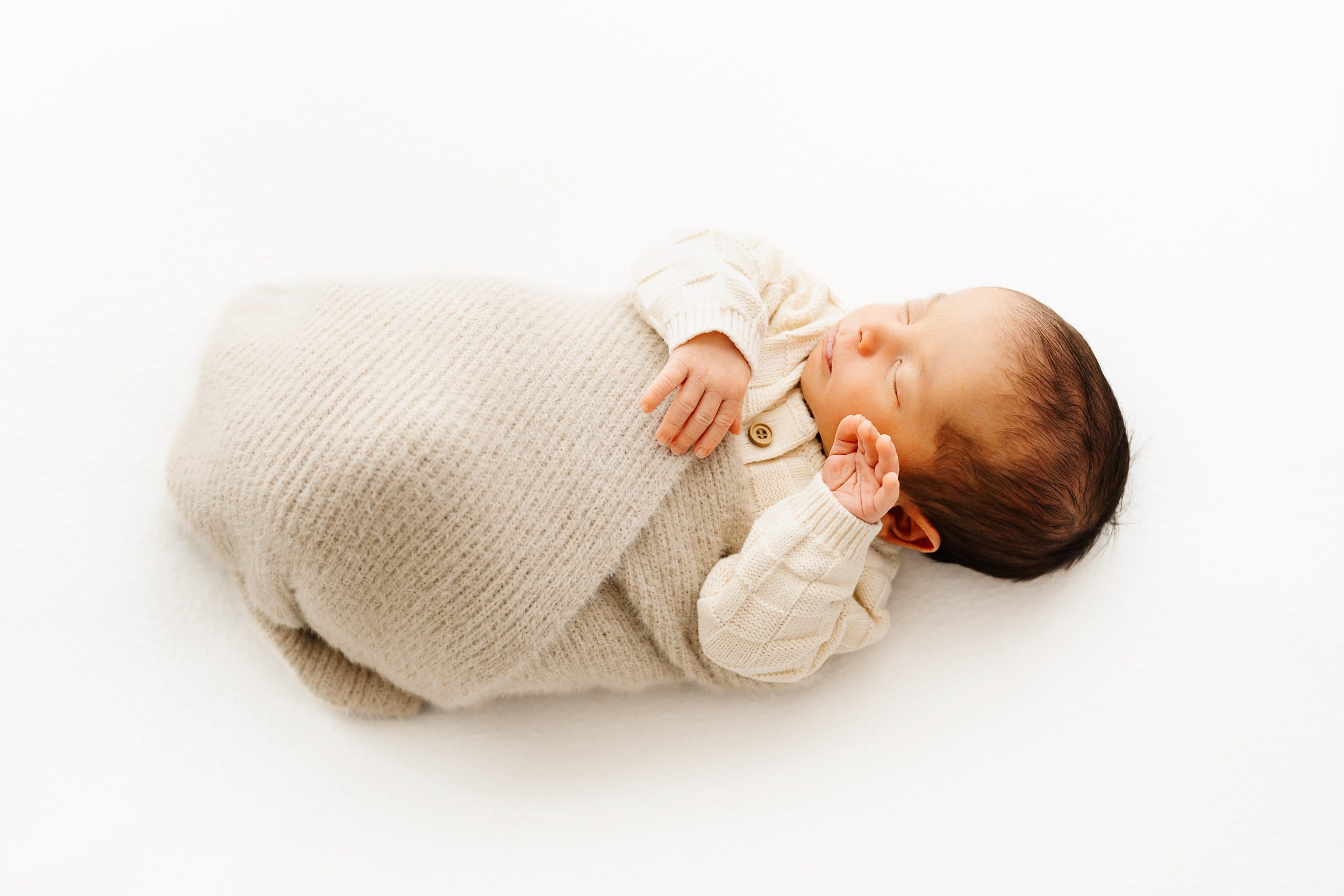 Nico looked absolutely adorable in a long sleeve textured knit romper from my Client Closet. The soft knit fabric added beautiful depth and texture while still keeping the overall look neutral and organic. At four weeks old, he was wonderfully alert at the start of our session, giving us the sweetest wide-eyed expressions before slowly melting into that dreamy newborn sleep.