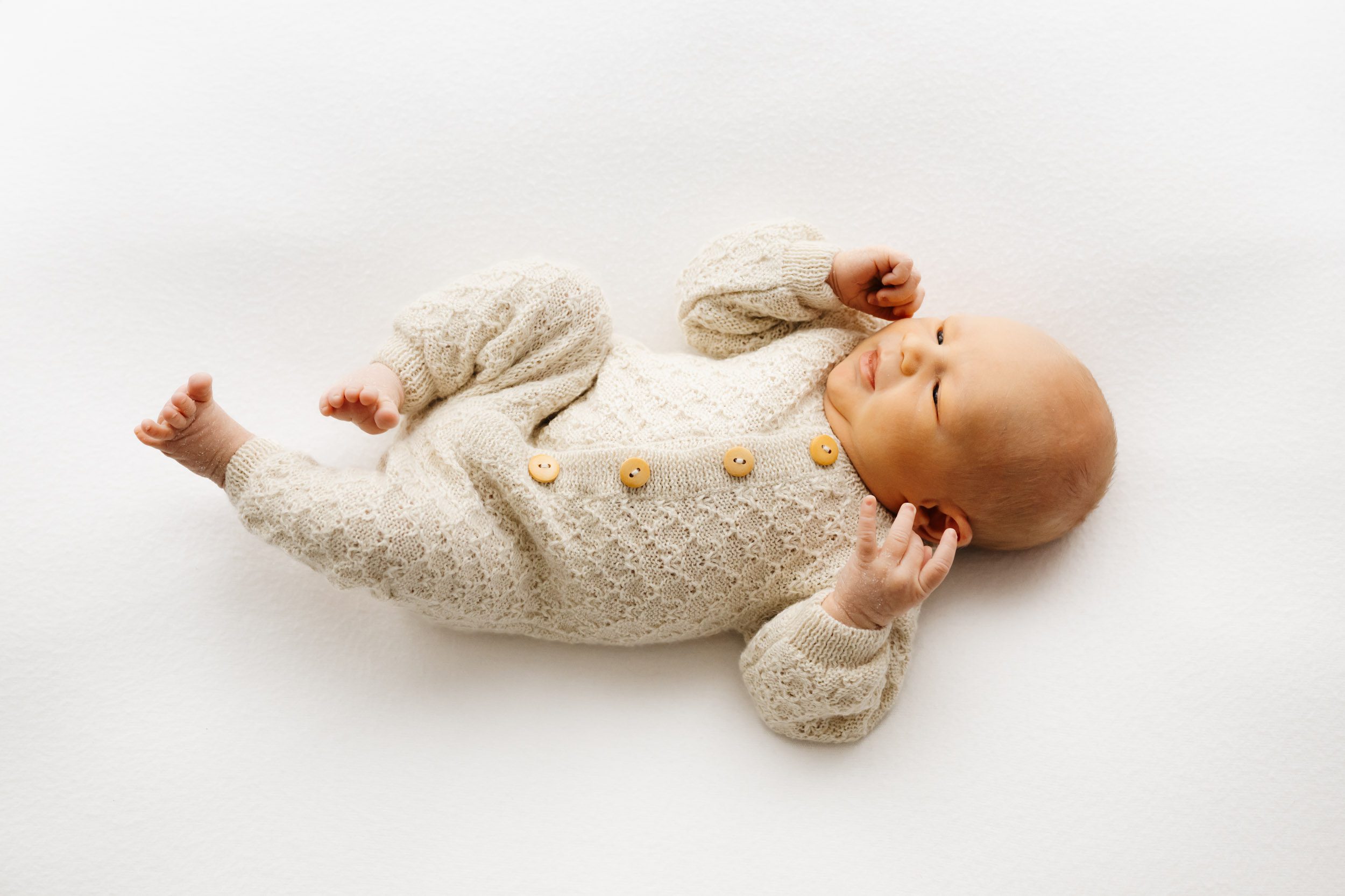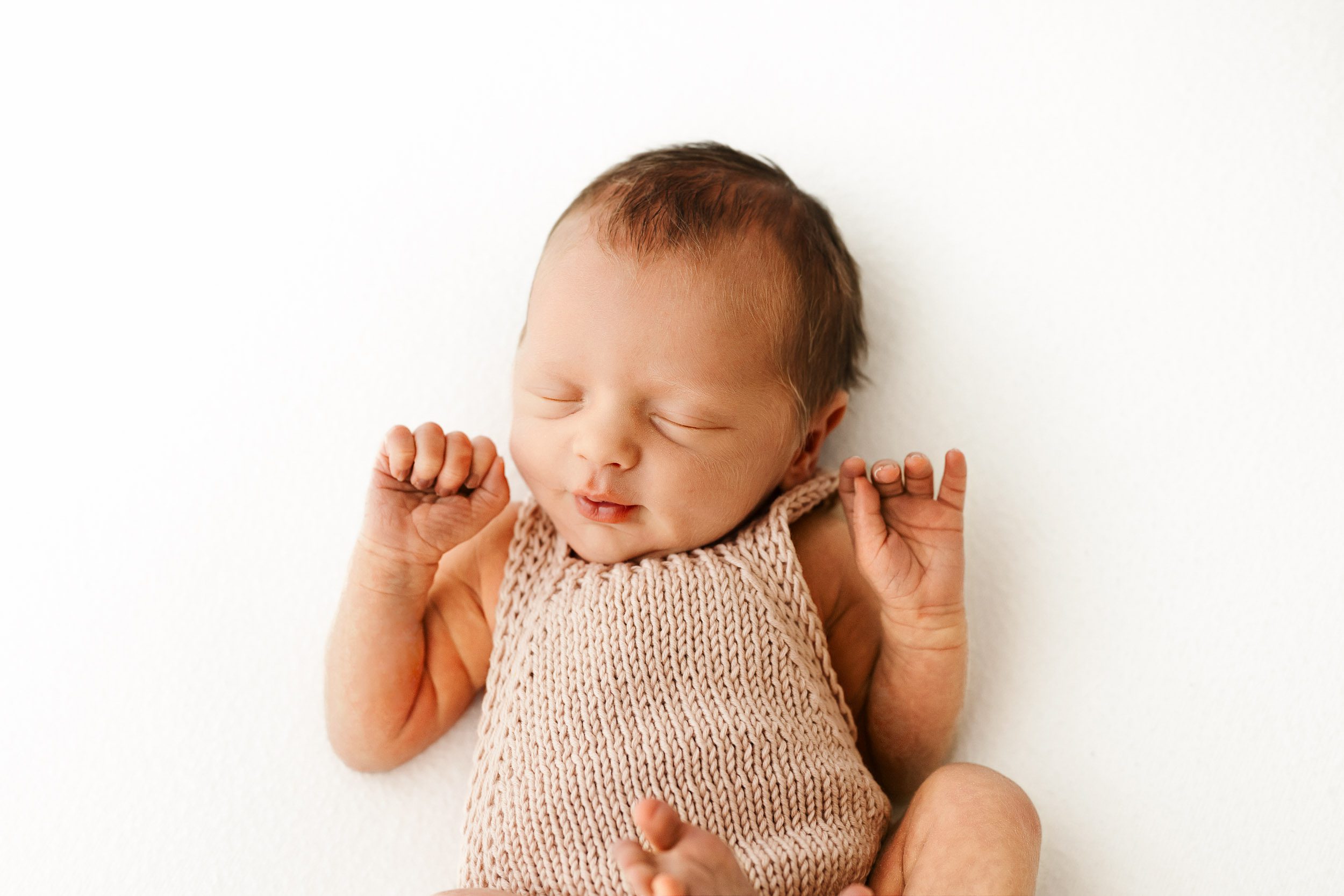 a baby girl in a knit onesie laying on a white background and touching her finger to her cheek as she looks directly at the camera during a studio newborn photoshoot