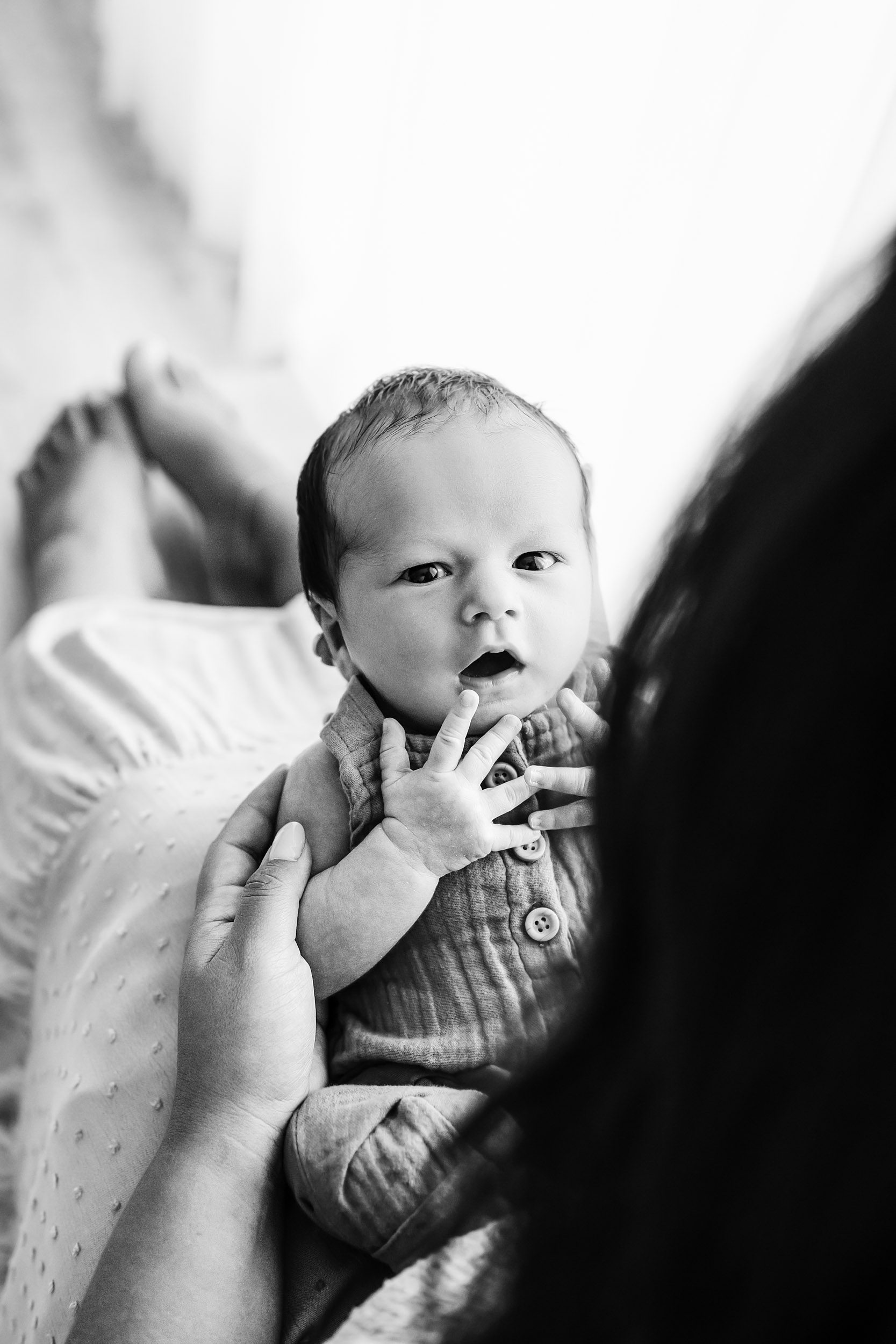 Your newborn is perfect just the way he or she is. As a natural newborn photographer, I don’t try to make babies fall asleep or place them in poses for pictures. When your baby is awake, we’ll capture those bright eyes, exploring the world with wonder. If she falls asleep, we’ll capture her sleeping peacefully like only a newborn can. If your baby only wants to be held, we can do the entire session with the baby in your arms because, let’s be honest, will you ever get enough baby snuggles? We’ll even capture those moments when your baby cries, so you can recall the most beautiful sound you ever heard right after your child was born.