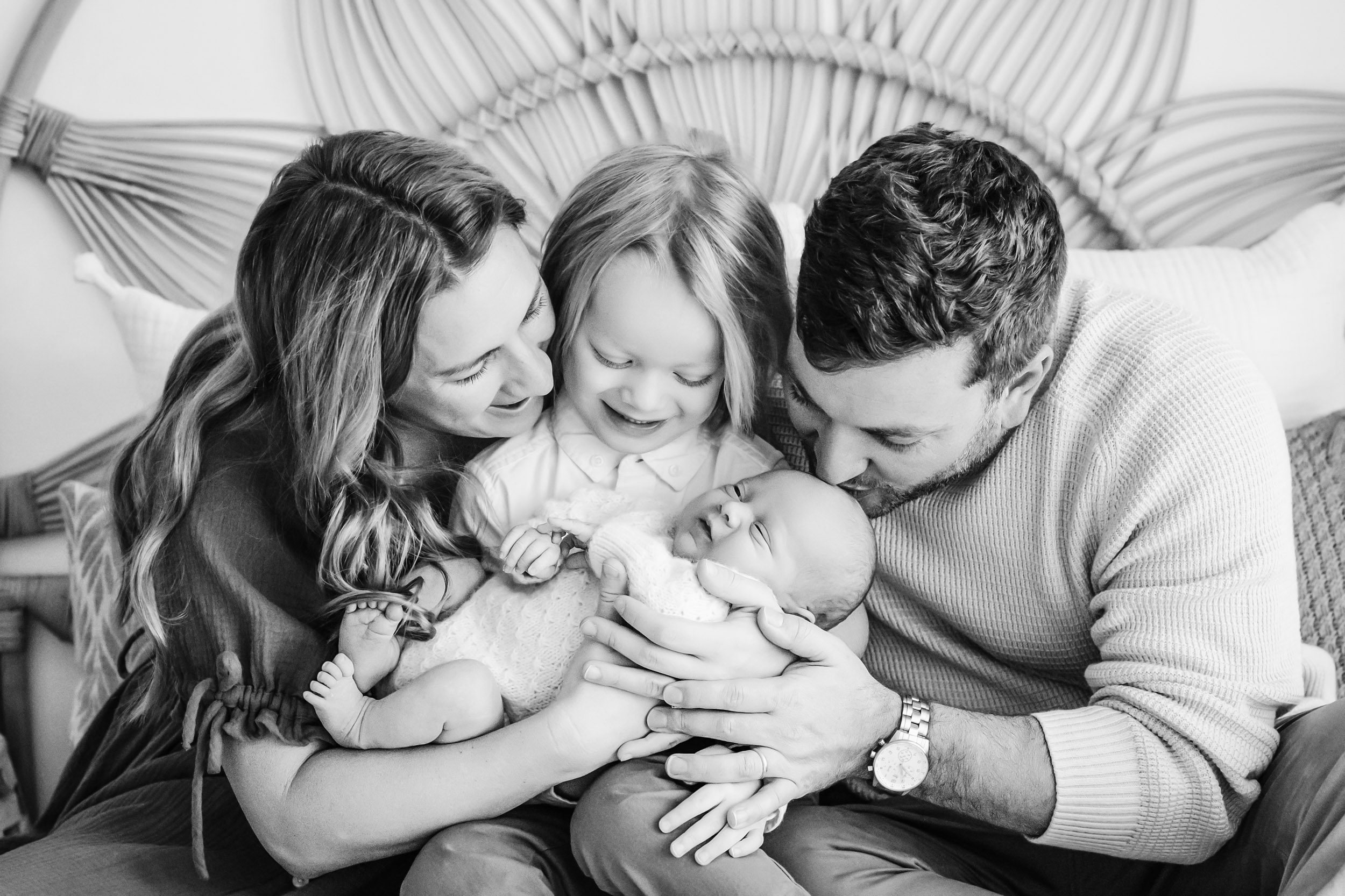 a family of four snuggling on a bed with dad smiling down at his baby girl in his arms and mom holds her older daughter on her lap as they look at each other and laugh during a newborn photoshoot