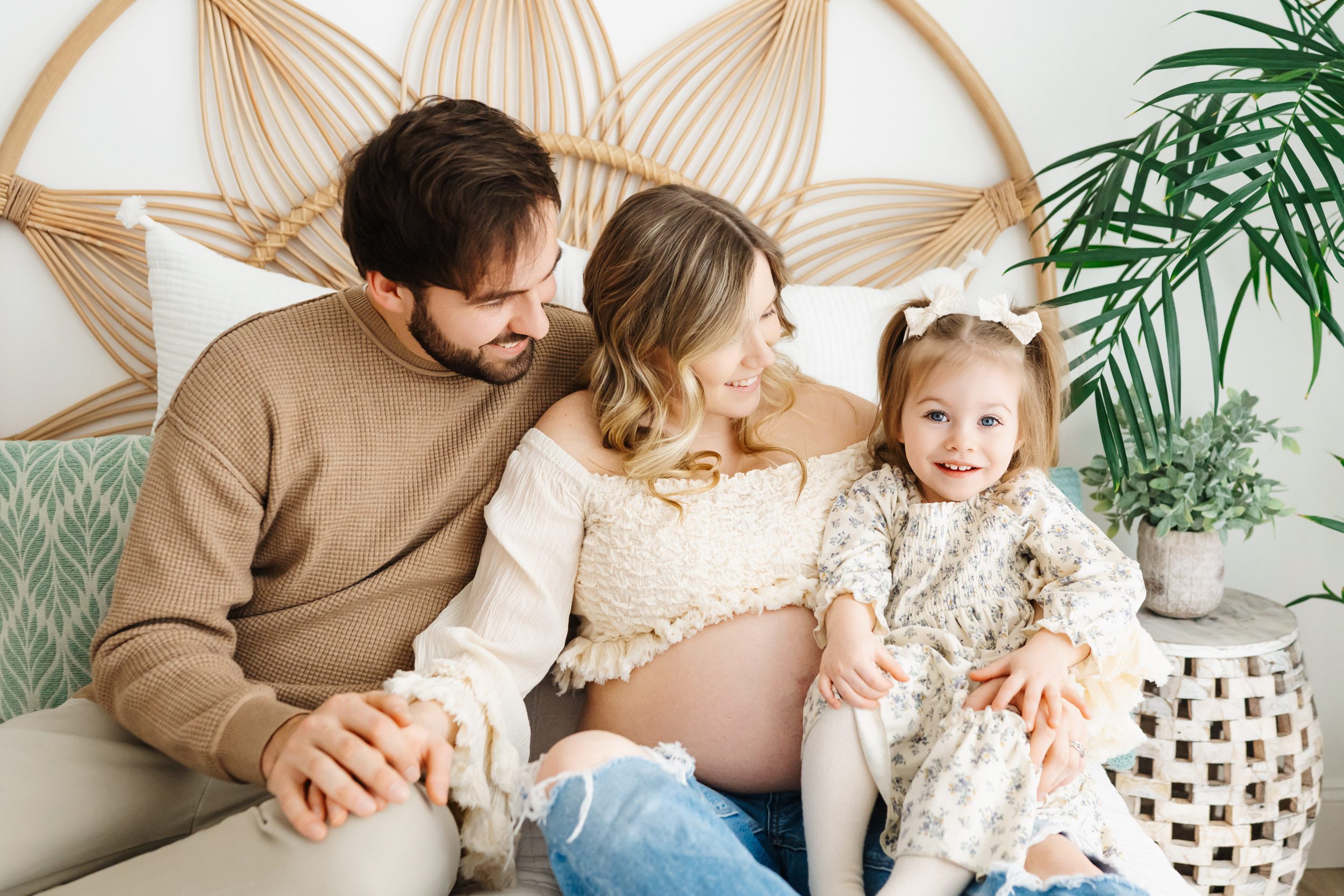 What made this warm & cozy maternity photoshoot even more special? It was Riley’s second birthday! Two huge milestones wrapped into one day—celebrating their first little girl, while also honoring the new baby they’re about to meet. Riley brought so much personality to the session, from sweet smiles to quiet moments touching her mom’s growing belly. No stiff posing, no pressure—just a family soaking in this season together.