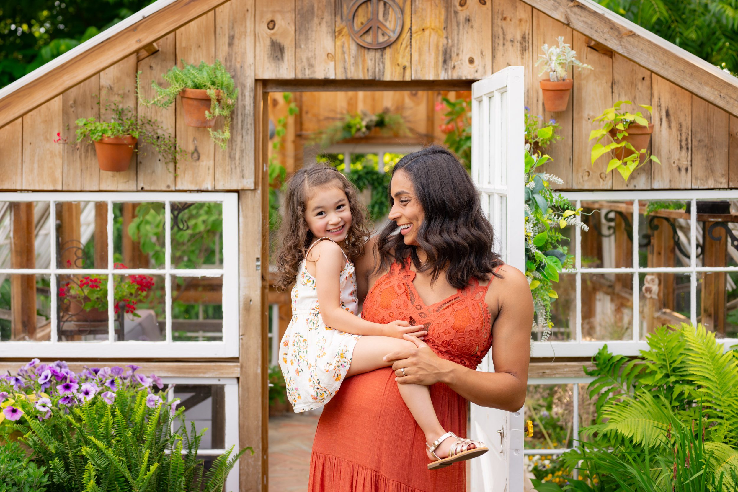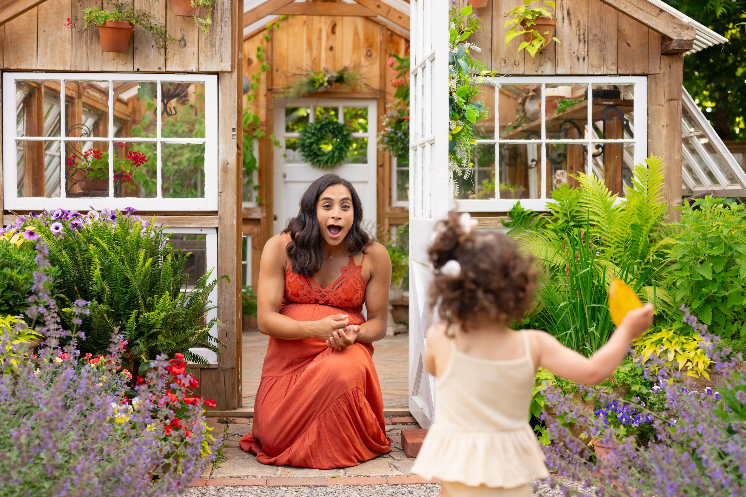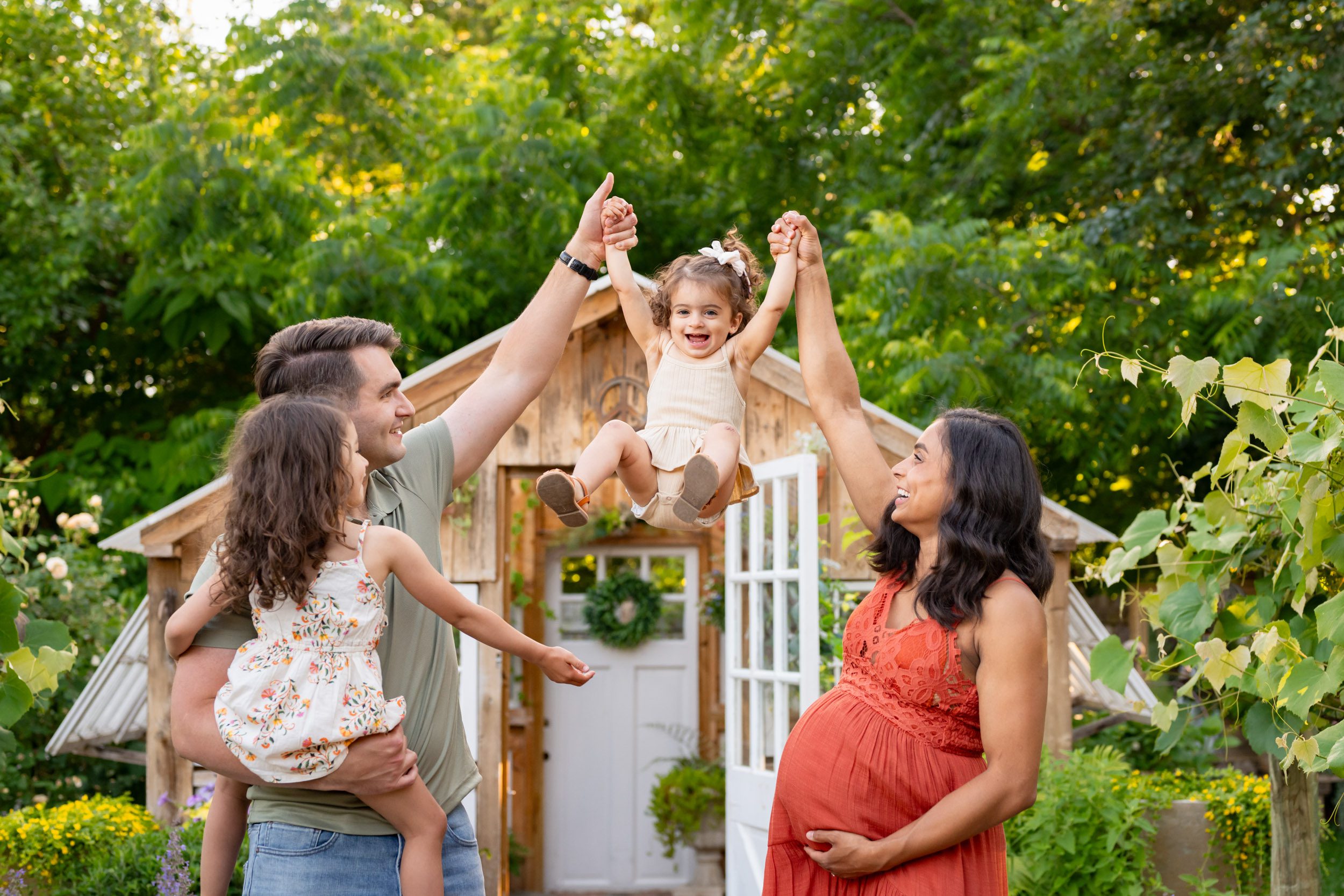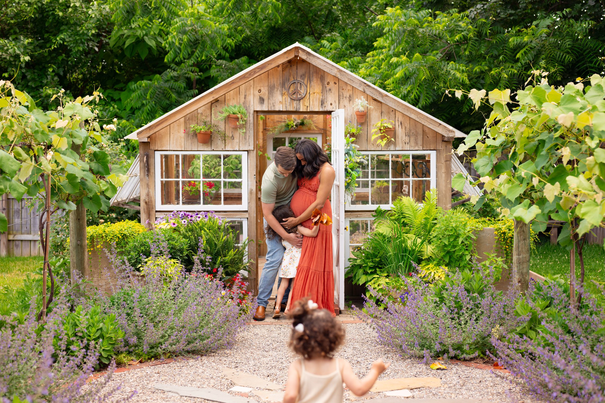 Our last step was to choose a location for their maternity photoshoot. Both of their girls were born in the winter, so our previous maternity sessions were in the fall. Mom knew she wanted to choose a spot with a spring/summer feel this time around to celebrate her only baby with a summer due date. I recommended this particular location in West Chester, PA to mom because I thought she’d love the “Secret Garden” vibe and would also appreciate that it’s a private garden with a fence where her girls would be free to explore without worrying about them running off while she and dad were getting a few maternity photos on their own.