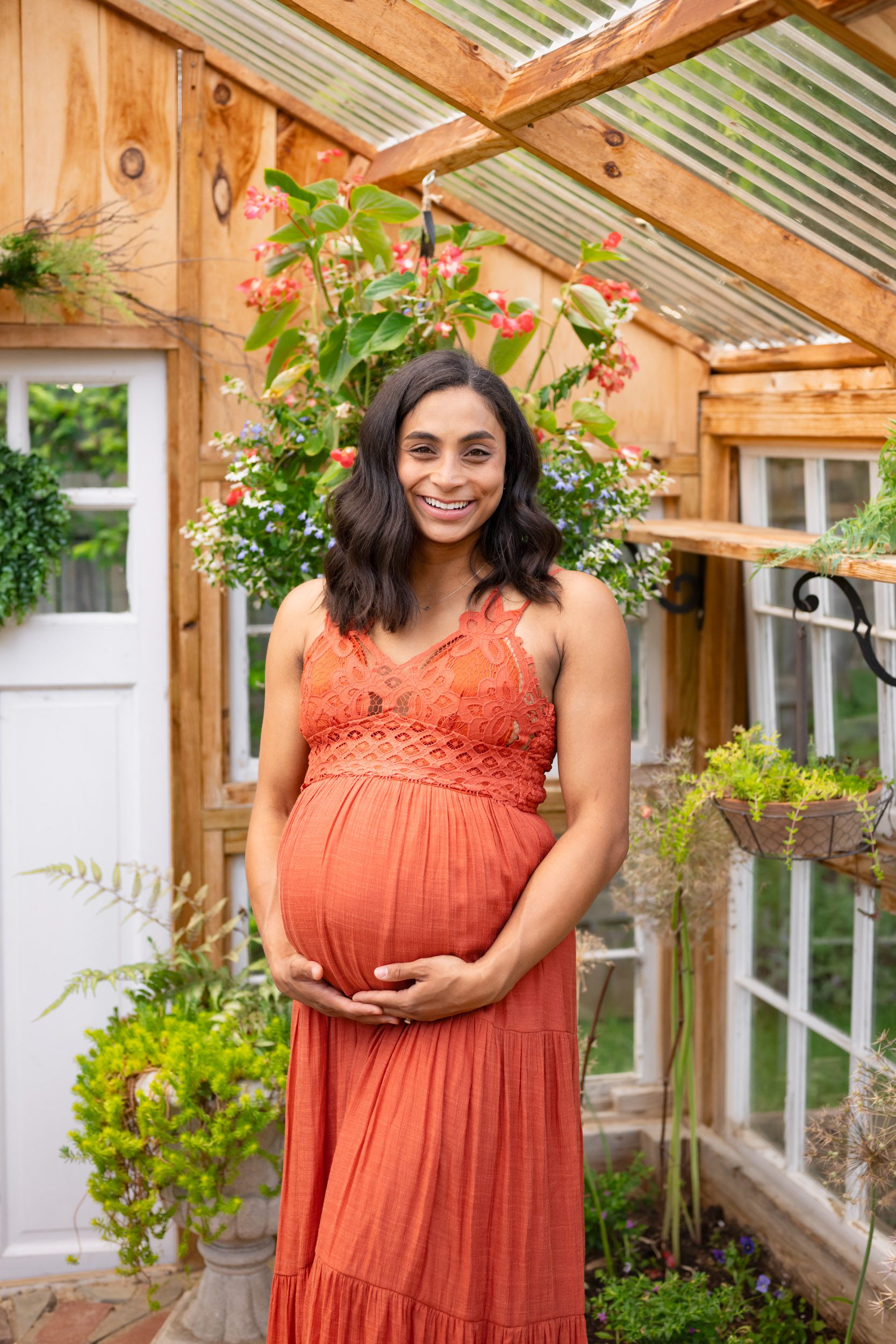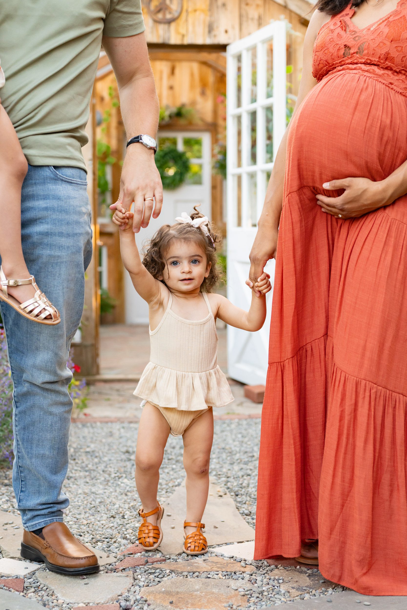 When mom came into my studio to check out my Client Closet and try on dresses for our maternity session, I couldn’t contain my excitement! I absolutely love her sense of style and she ALWAYS knocks her family outfits out of the park. After trying on a bunch of dresses, she selected this burnt orange summer dress with a lacy top. I always encourage moms to pick their outfit first and then select the kids and dads’ outfits. So once she had picked her dress, she went home with a vision and selected an adorable floral print dress for her older daughter and kept dad and little sis in solid colors to round out the look.
